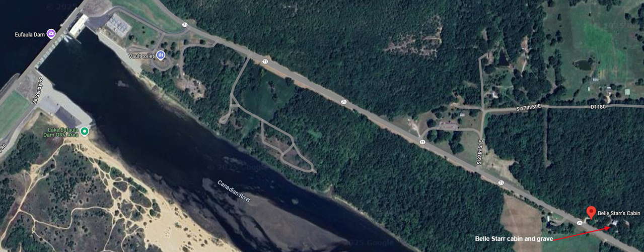 Youngers Bend Grave of Outlaw Queen Belle Starr, Near Porum, OklahomaThe grave and cabin of the outlaw queen Belle Starr located at Younger's Bend, on Highway 71 a mile east of the Lake Eufaula Dam near Porum, Muskogee County, Oklahoma |