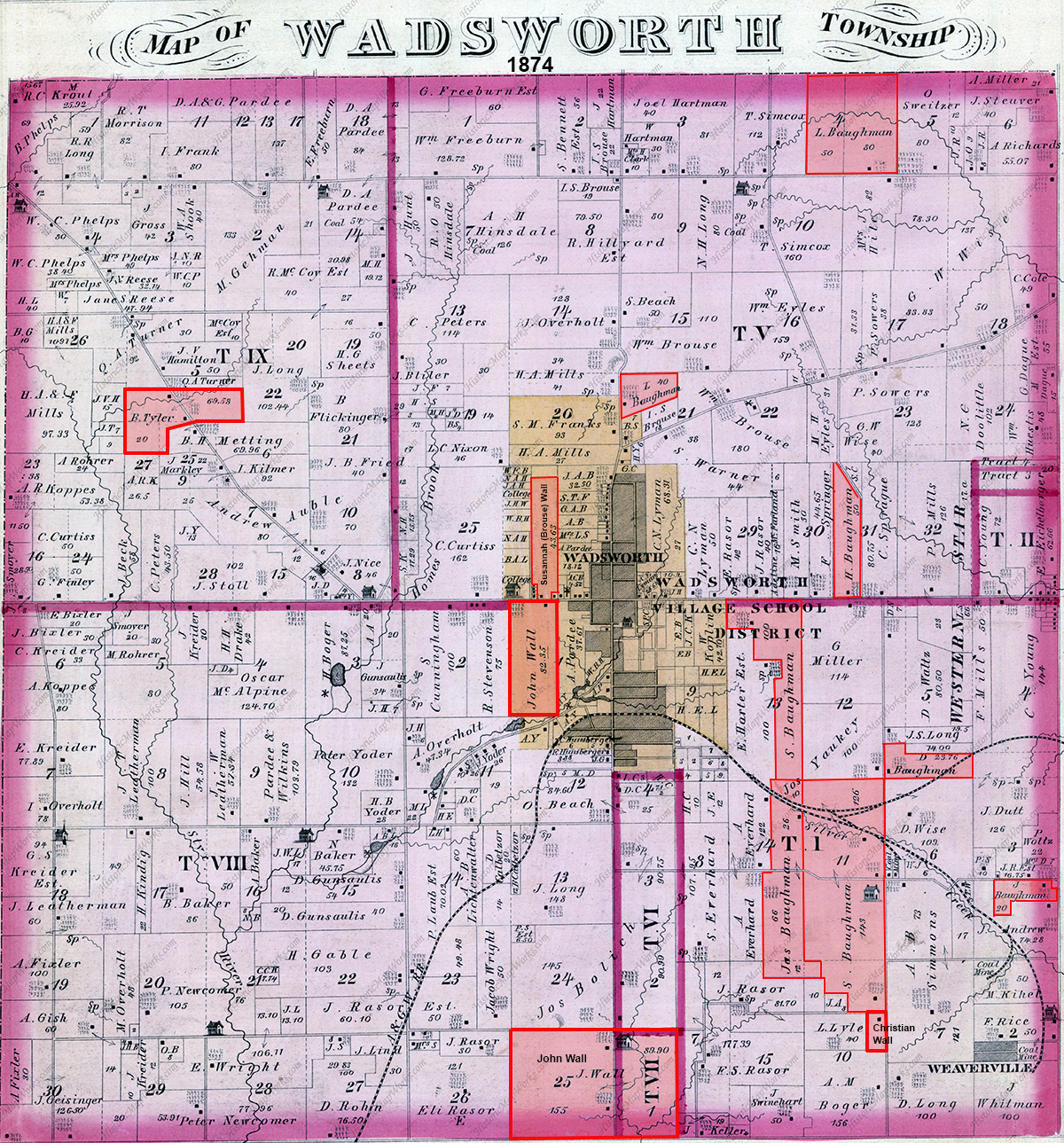 1874 property owner map of Wadsworth showing Wall relatives including our ancestor Benjamin Tyler (Tract IX, upper left), John Wall, brother of our