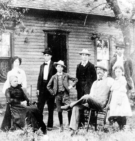 ![]() Lurana (1865-1904) and Ancil Whitsitt family (sitting) - about 1902, wedding day of Dulcie (young woman standing far left) and Louie Dittmar (young man standing far right); left to right the children are: Joseph W., Hiram H. (hands of hip), John B.; young girl far right in front by Ancil is Ruth M. Whitsitt |
