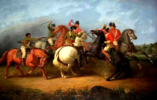 The Battle of Cowpens, painted by William Ranney in 1845. The scene depicts an unnamed African American soldier (left) firing his pistol and saving the life of Colonel William Washington (on white horse in center). The name of the battle derived from the fact it was fought in a cow pasture near Camden, South Carolina, January 19, 1781. |