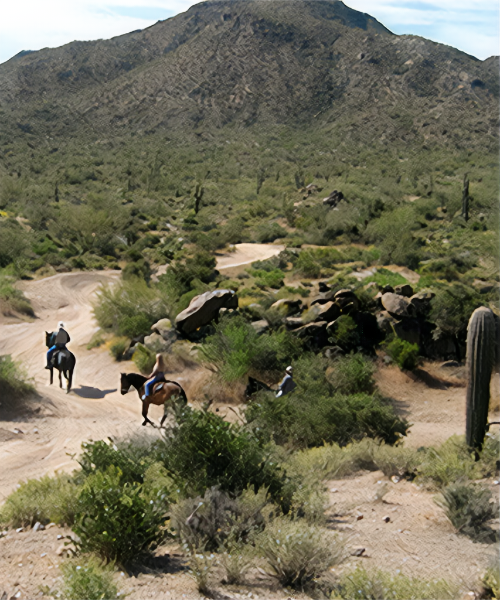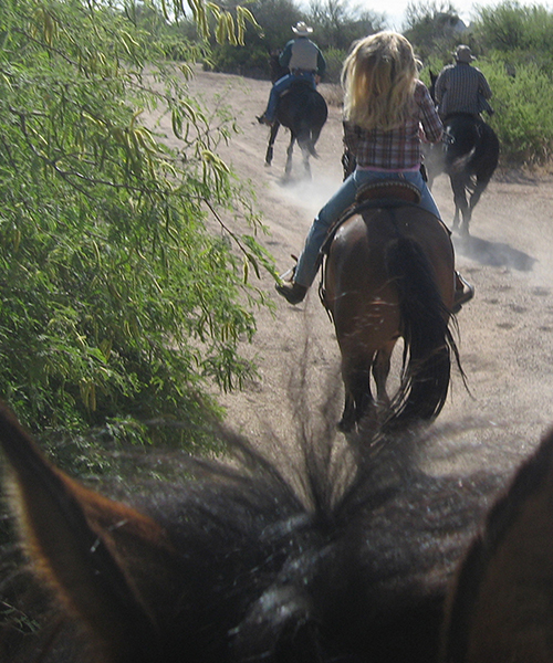 May 2, 2010, KJ Koch leading another trailride on the Bulldog Canyon trail; Usery Mountain in the background; I rode up a hilll off the trail to take this picture |