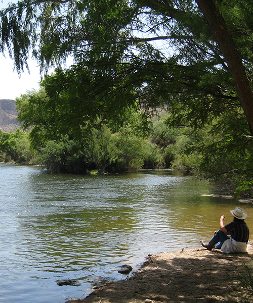 May 2, 2010, Rosie Snell taking in the view of tubers on the Salt River opposite the Pebble Beach Recreation Area on the other side of the river |