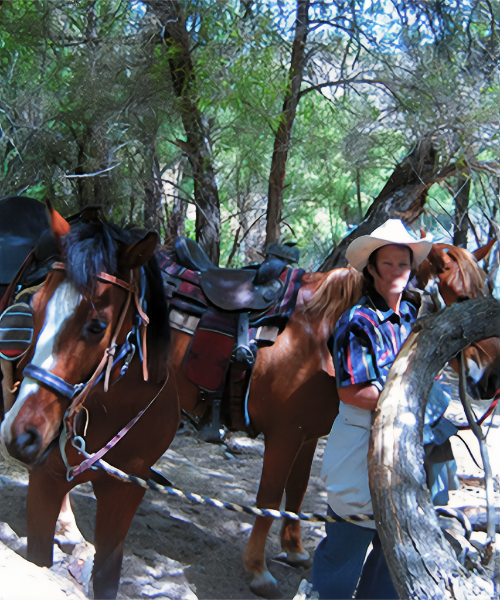 Rosie tying up Cinnamon (Dollar in the foreground) in the shady grove we found on the bank of the Salt River down river from Saguaro Lake |