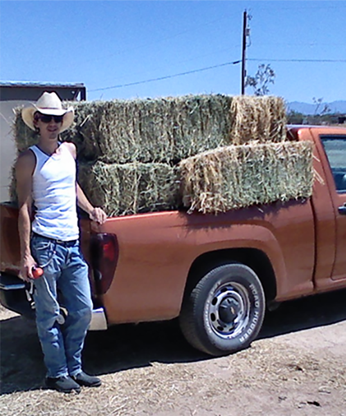August 12, 2010, grandson Michael Wall and his Silverado pickup after we bought hay for the horses, Andy Perry Drive, Florence, Arizona |