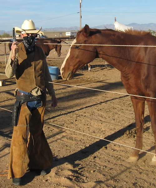 October 31, 2010, grandson Michael Wall dressed up to rob a bank on Holloween as Mocha and Passy look on wondering, "What the hell..." - my "ranch" on Andy Perry Drive, Florence, Arizona |