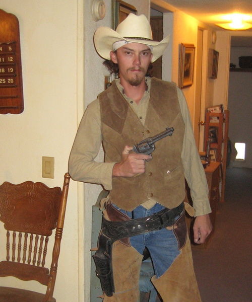 Michael's Hollween costume; the gun and holster were given to me by my friend Milo; the gun was Hollywood prop gun unable to actually shoot. Years later I gave the gun and holster to my son-in-law Joey Madia |