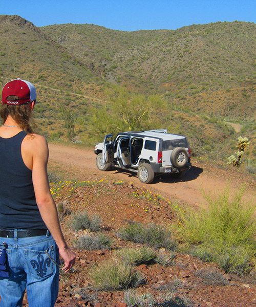 March 4, 2012, our first off road trip through Box Canyon located in the Pinal Mountains north-east of Florence; Mike checking for damage after going over big rock in the middle of the wash; fortunately, no damage |