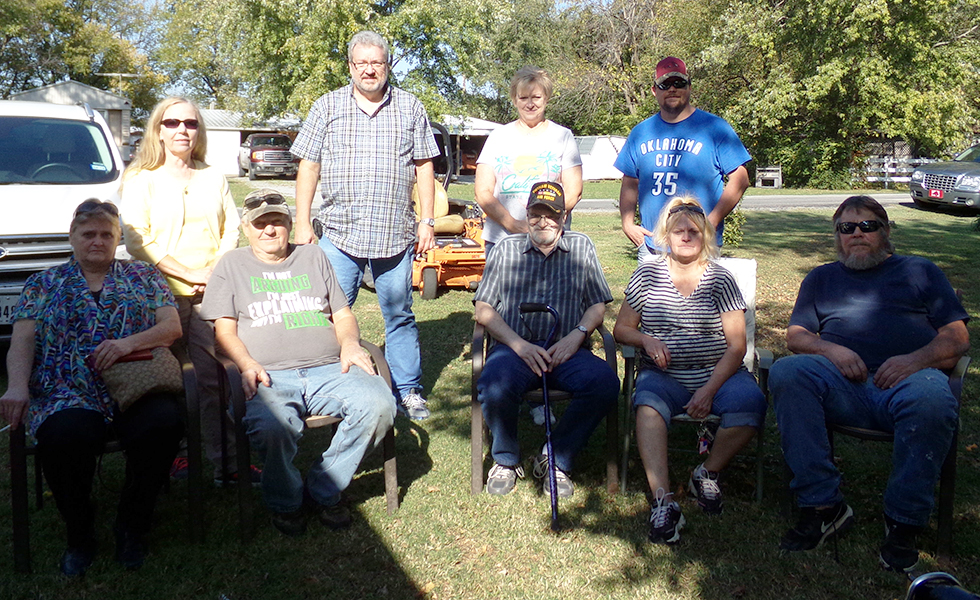 August 23, 2016, Chouteau, Oklahoma; Mike, Diane and I drove from Muldrow to see Uncle Gerry Corbett and his family; from L->R, Joyce (Corbett) Ray, Tammy (Young) Corbett widow of Gerry's son Gerald Jr. (1958-2014), Uncle Gerry, Mike, Diane, me, Debra (Corbett) and Riley Cantrell; the young man in the blue tee shirt is one of Debra and Riley's sons |