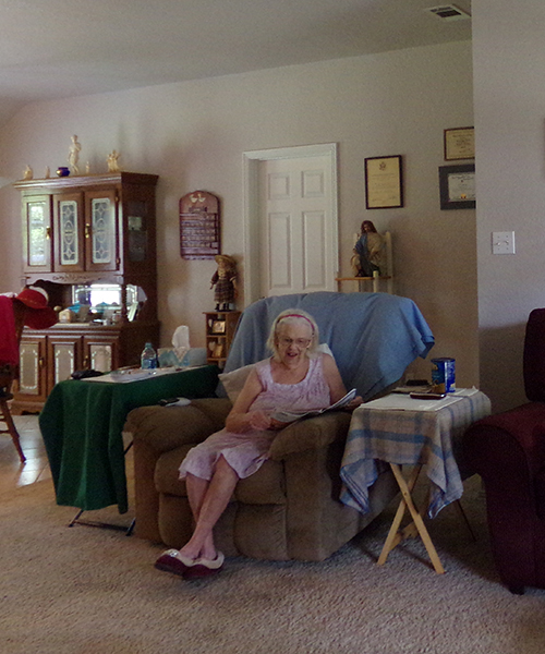 April 19, 2017, Sue in her favorite chair, the living room, dinning room area, North 55th place, Fort Smith |