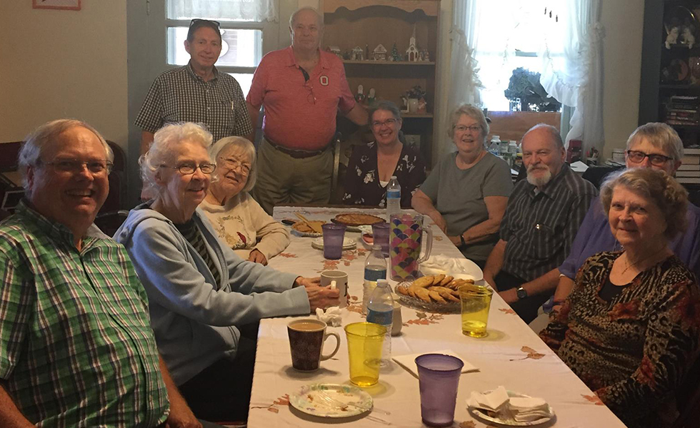 September 30, 2018, family reunion dinner at Aunt Grace's; left to right, cousins Denny Shanafelt,Jean (Mullet) Coleman, Aunt Grace, Bill Beck (cousin Shirley's husband), Vivian, Laurel (Shanafelt) Tolbert, Peggy, me, Ruth (Lahr) Shanafelt and Lois (Mullet) Lee, Fixler Road, Montville Township, Ohio |