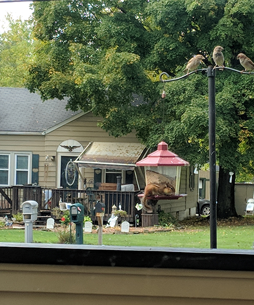 October 7, 2018, Finches and the little chipmonk that lived under my porch stealing food from my bird feeder |