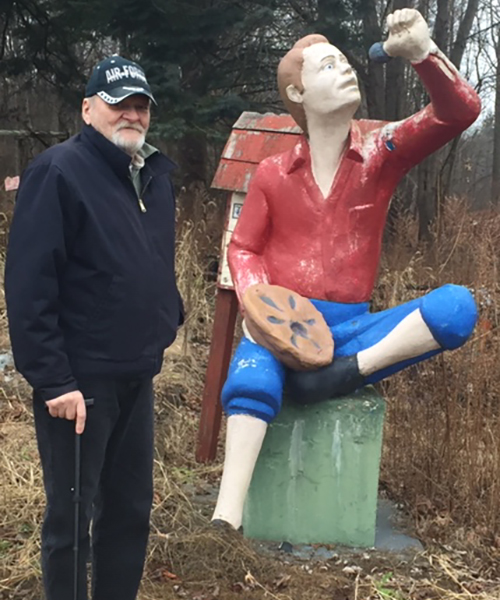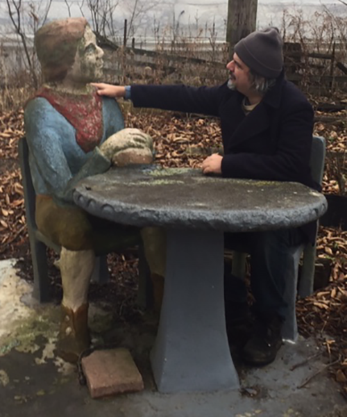 January 2, 2019, Joey Madia, Leavittsburg's old Fairy Land, having a conversation with some mythical dude; the nursery where these figures were located no longer exists |