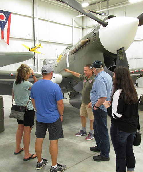June 8, 2019, Tri-State Warbird Museum, me and Jolie listening to guide telling about the Curtis P-40 WWII fighter plane owned by the museum |