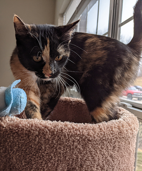 February 26, 2021, Sara comes home to Glenn Hollow Apartments, Alexandria - I had to wait for Sara to get a health exam and shots; in the meantime I bought her a cat tree, which she claimed as hers immediately |