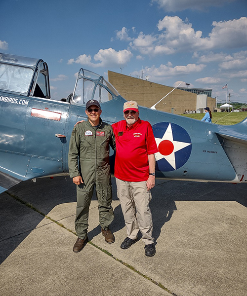 July 14, 2019, the year I joined the Cincinnati Warbirds and got my red shirt; Mike and I reviewing the photos I took, at his home, Cold Springs, Kentucky |