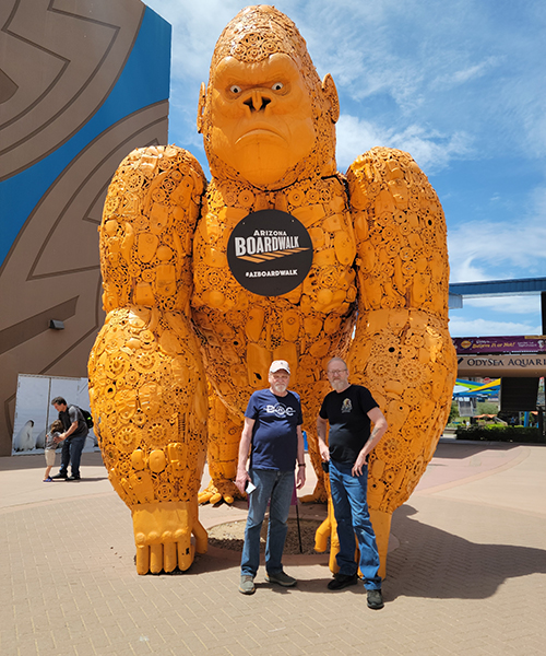 Arizona Boardwalk, father and son, Ron and Bruce Wall and the King Kong statue made entirely of machinery parts |
