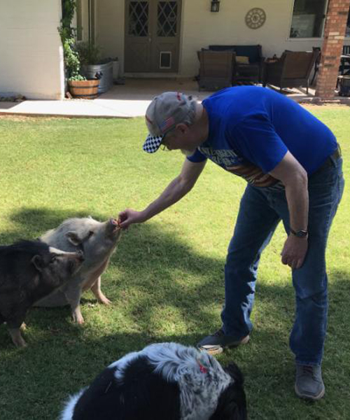May 11, 2022, Gilbert, Arizona at the home of neice Heather (Wall) Young making friends with her pet pigs and dog |