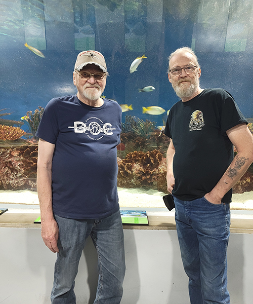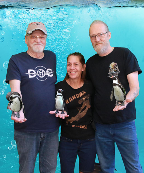 May 11, 2022, me, Terri and Bruce, souvenier photo (no, not real penquins - added by photo magic), Odysea Aquarium |