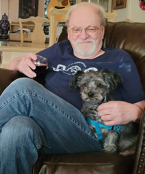May 11, 2022, Mesa, Arizona, relaxing at Bruce and Terri's with a glass of wine and new friend Tucker |
