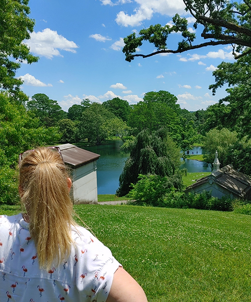 May 30, 2022, Tonya enjoying the view of one of the lakes in the Spring Grove Cemetery |
