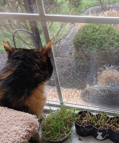 March 12, 2023 - Sara and her pet squirrel on my window ledge, Glenn Hollow Apartments, 600 Brentwood Lane, Alexandria, Kentucky |
