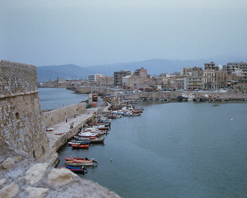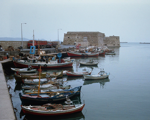 Heraklion Harbor, Rocca a Mare Fortress at the north end of the pier and Greek fishing boats, April 1977 |