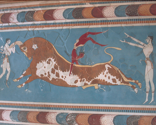 The ancient sea faring Minoan civilization occupied Crete from about 7000 BC to around 1200 BC; this fresco represents the sport of bull leaping described in ancient Greek mythology |