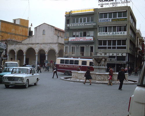 Basilica of Saint Mark (left of the bus) in Lions Square, Heraklion built by Italian Venetians (Venice) in 1239 after the Venetian conquest of Crete during the Fourth Crusade |