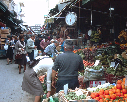 Lots of good fruits and veggies and fresh gyro (goat meat) (usually swarmed by flies); I didn't have the nerve to try it. |