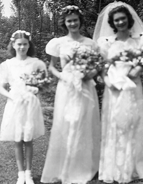 Bride's Maids my Aunt Elinor (left), Aunt Dorothy with the bride. Elinor still alive in 2023. Elinor told me that it was so hot this day in June that she became sick and the wedding was interrupted until she felt well enough to go on. |
